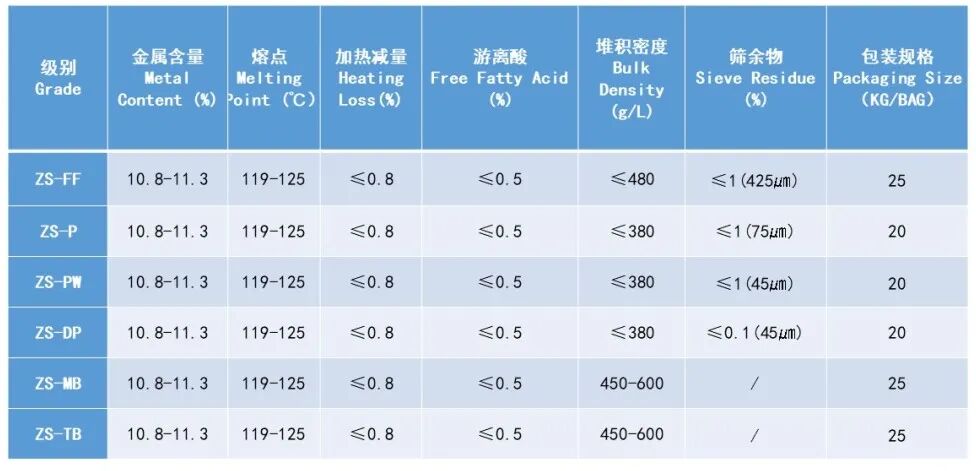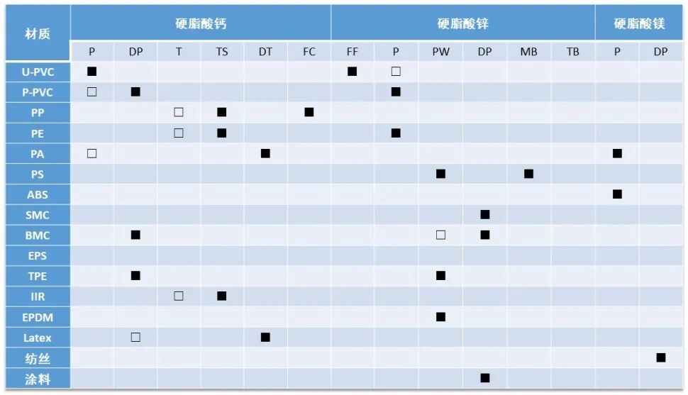 硬脂酸鹽是最常使用的脂肪酸鹽類,脂肪酸鹽是長(zhǎng)碳鏈脂肪酸與不同價(jià)金屬元素形成的化合物。比較廣泛使用的硬脂酸鹽有鈣鹽,鋅鹽,鎂鹽和鋁鹽。